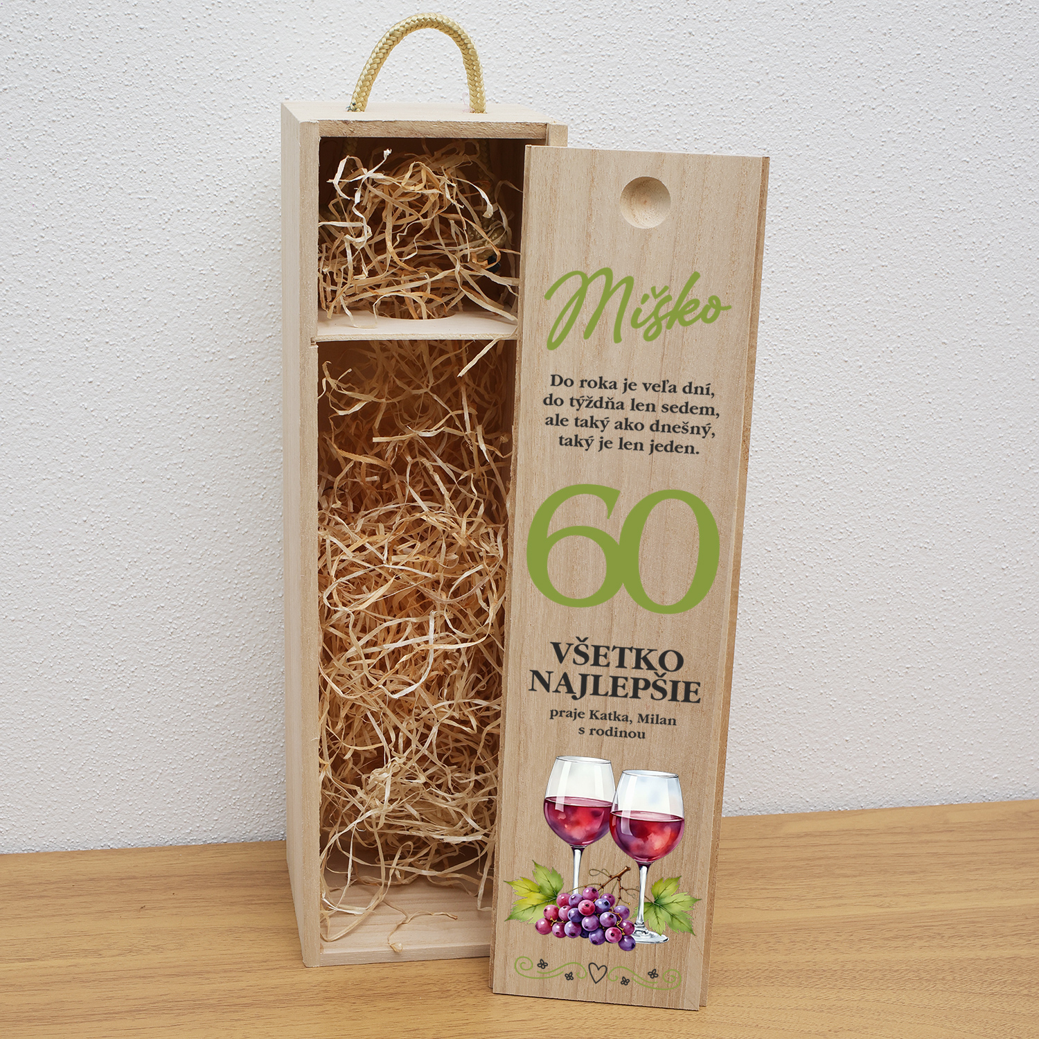 Drevená krabica na fľašu je elegantný a praktický darček, ideálny na oslavu jubilea alebo inej výnimočnej príležitosti. Vyrobená je z kvalitného dreva Paulovnie plstnatej a zdobená precíznym gravírovaním, ktoré je možné prispôsobiť podľa vašich predstáv. Personalizácia menom, dátumom a krátkym venovaním dodáva darčeku jedinečný a osobný charakter. Drevená škatuľa poskytuje nielen štýlové balenie pre fľašu vína, destilátu či iného nápoja, ale zároveň slúži ako trvalá pamiatka, ktorú si obdarovaný môže uchovať ako milú spomienku na svoj významný deň.