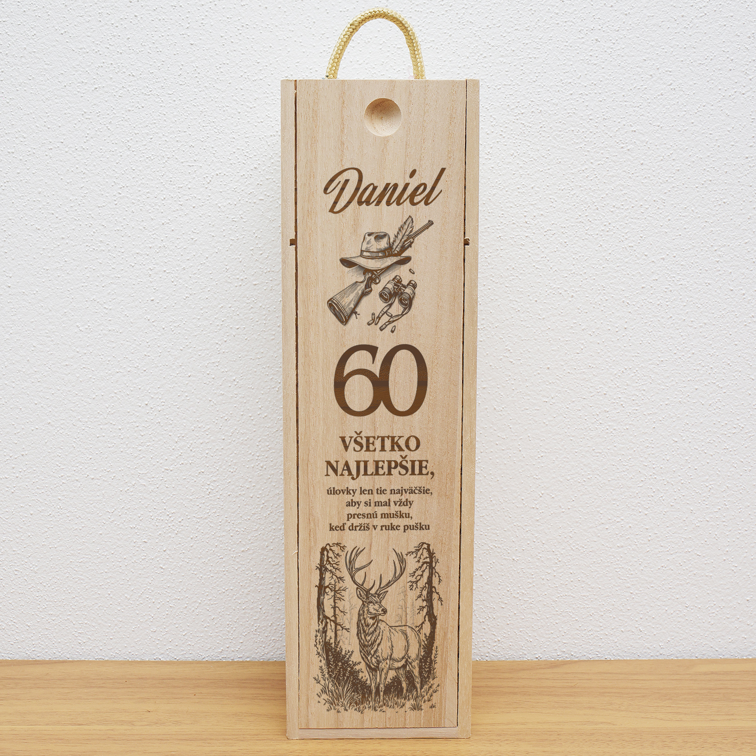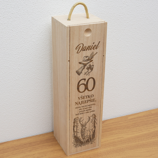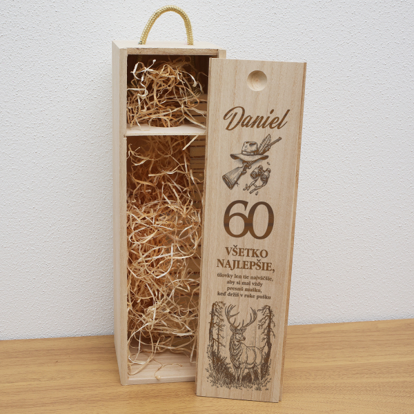 Drevená krabica na fľašu pre poľovníka je elegantný a praktický darček, ideálny na oslavu jubilea alebo inej výnimočnej príležitosti.