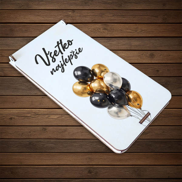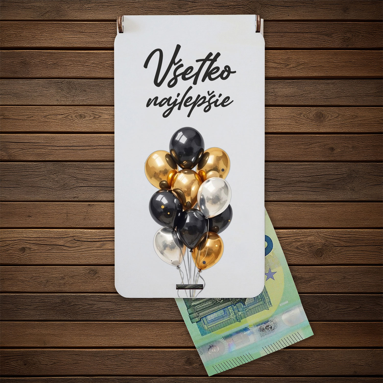 Originálna drevená krabička na peniaze s veselým motívom balónov je štýlový a zároveň praktický spôsob, ako darovať finančný dar k narodeninám. Vďaka precíznemu spracovaniu a farebnej potlači pôsobí elegantne a slávnostne – ideálna ako milá pamiatka na výnimočný deň.