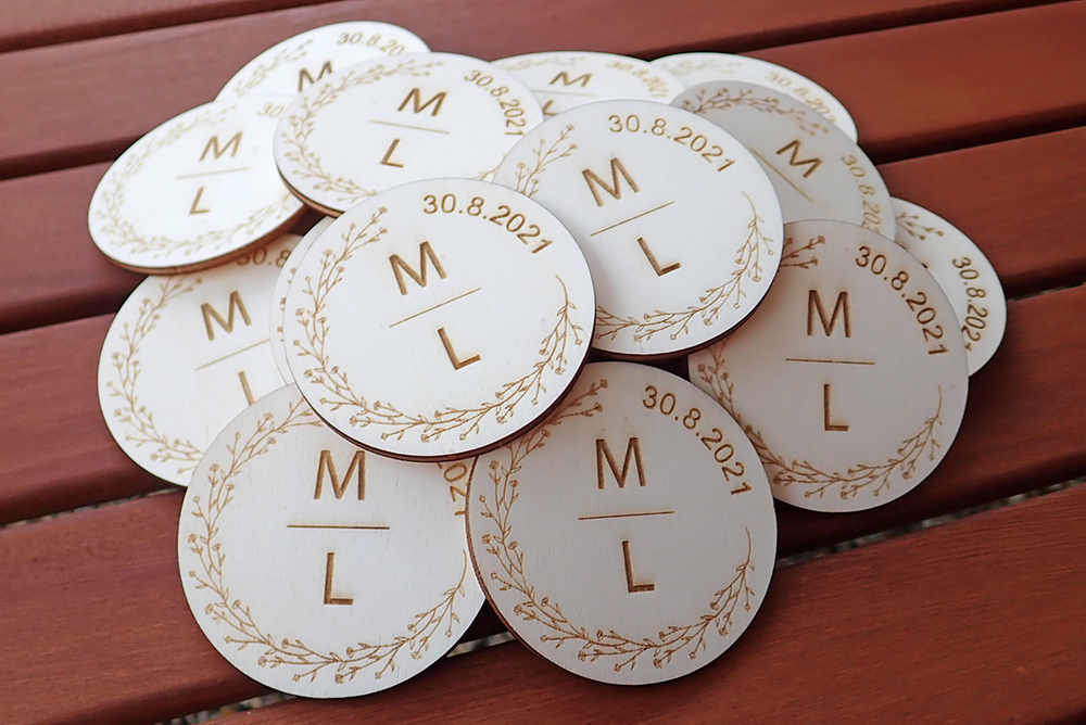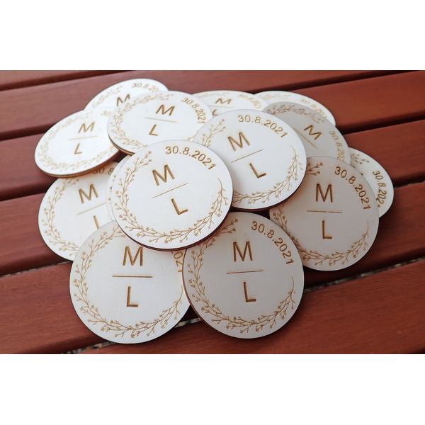 Drevená magnetka v tvare kruhu je originálnym darčekom od mladomanželov pre svadobčanov. Obsahuje iniciály, dátum svadby a jemný motív halúzky s kvietkami, vďaka čomu je krásnou pamiatkou na váš veľký deň.