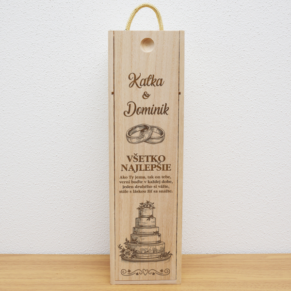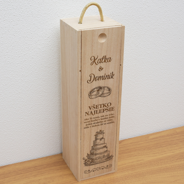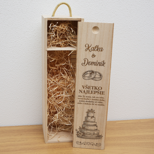 Drevený box na fľašu je elegantný a praktický darček, ideálny na oslavu jubilea alebo inej výnimočnej príležitosti. Vyrobený je z kvalitného dreva Paulovnie plstnatej a zdobený precíznym gravírovaním, ktoré je možné prispôsobiť podľa vašich predstáv. Personalizácia menom, dátumom a krátkym venovaním dodáva darčeku jedinečný a osobný charakter. Krabica poskytuje nielen štýlové balenie pre fľašu vína, destilátu či iného nápoja, ale zároveň slúži ako trvalá pamiatka, ktorú si obdarovaný môže uchovať ako milú spomienku na svoj významný deň.