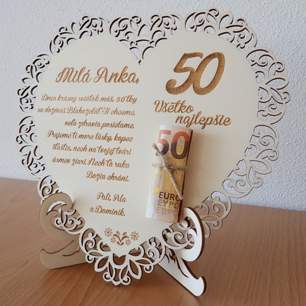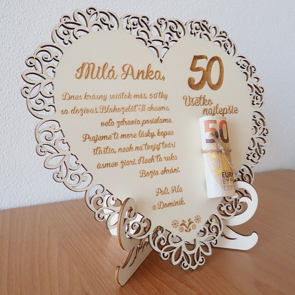Drevená tabuľka v tvare srdca je ideálnym darčekom k jubileu. Vyrobená z preglejky, kombinuje jemnosť a trvácnosť prírodného materiálu s precíznym laserovým vyrezávaním a gravírovaním. Tabuľka môže byť personalizovaná s menom oslávenca a jedinečným venovaním, čím sa stáva osobitým a nezabudnuteľným darom. Je to krásny spôsob, ako vyjadriť svoje želania pri významných životných udalostiach, pričom tvar srdca symbolizuje lásku a úctu k oslávencovi.