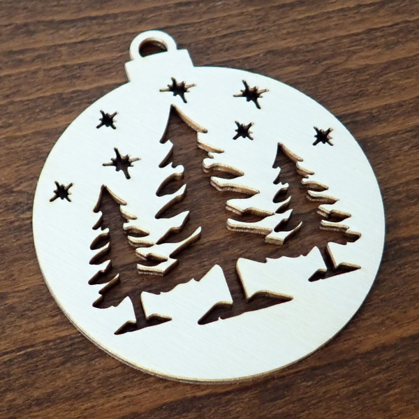 Drevená vianočná ozdoba na stromček guľa s krajinkou. Drevená dekoračná ozdoba je krásnym doplnkom každého vianočného stromčeka, je vhodná aj na dekoráciu na vence, kytice … Obľúbené drevené ozdoby zútulnia váš domov a dodajú mu harmóniu a pocit pokoja. Vianočná ozdoba je vyrezaná gravírovacím laserom. Materiál: topoľ – preglejka 3 mm, povrch: prírodný. Rozmery 80 x 93 mm. Počet 1 ks.