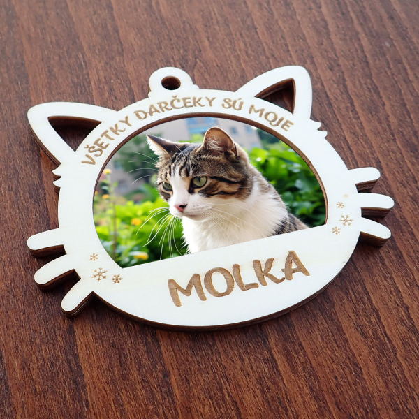 Drevená vianočná ozdoba s menom a vlastnou fotkou pre mačičku