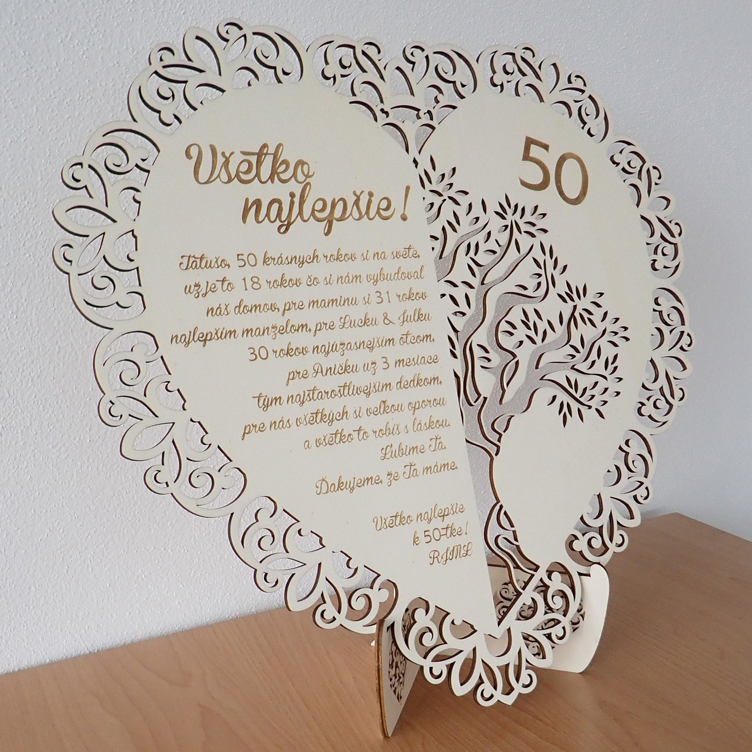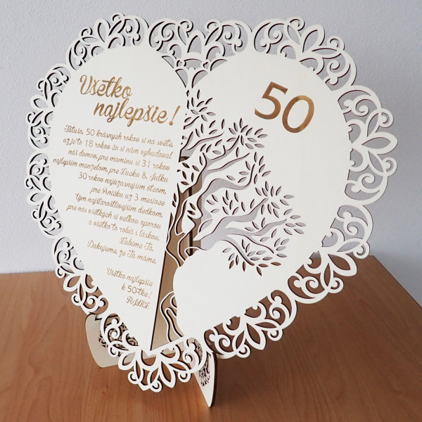 Drevené vyrezávané srdce so stromom k jubileu, 50x48cm