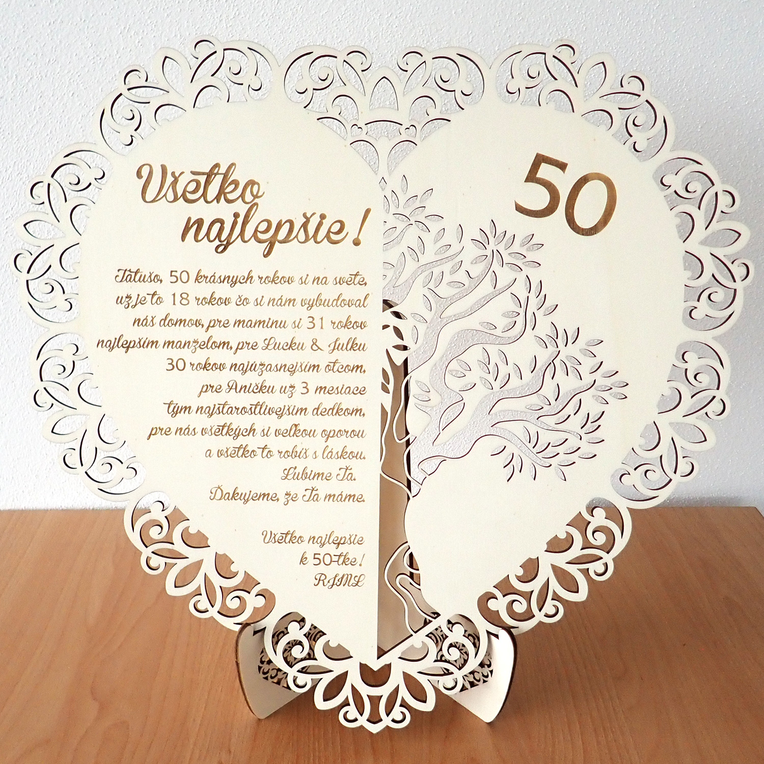 Drevené vyrezávané srdce s vyrezaným stromom k jubileu je originálnym a štýlovým darčekom, ideálnym k narodeninám alebo výročiu. Toto vyrezávané srdce je vyrobené z kvalitnej 5 mm preglejky, čo mu dodáva pevnosť a trvanlivosť. S dodávaným stojančekom sa stáva výrazným dekoratívnym prvkom pre každý interiér. Drevené vyrezávané srdce nie je len dekoratívnym prvkom, ale aj výnimočným spôsobom vyjadrenia lásky a významných udalostí.