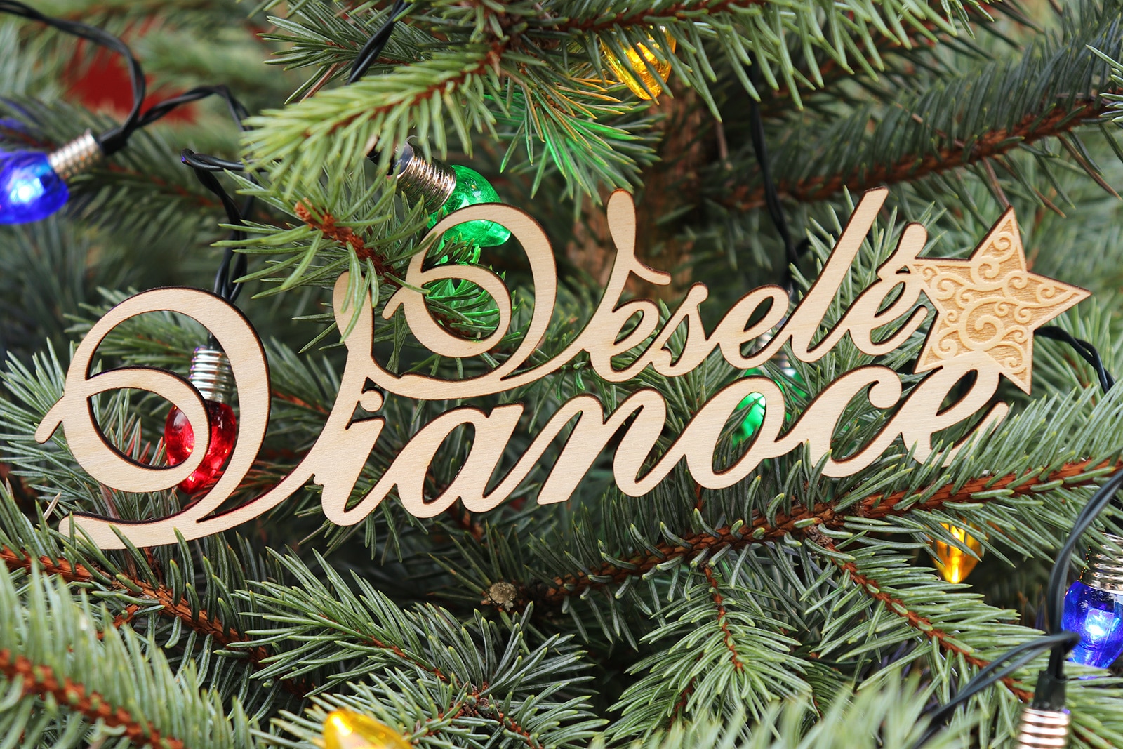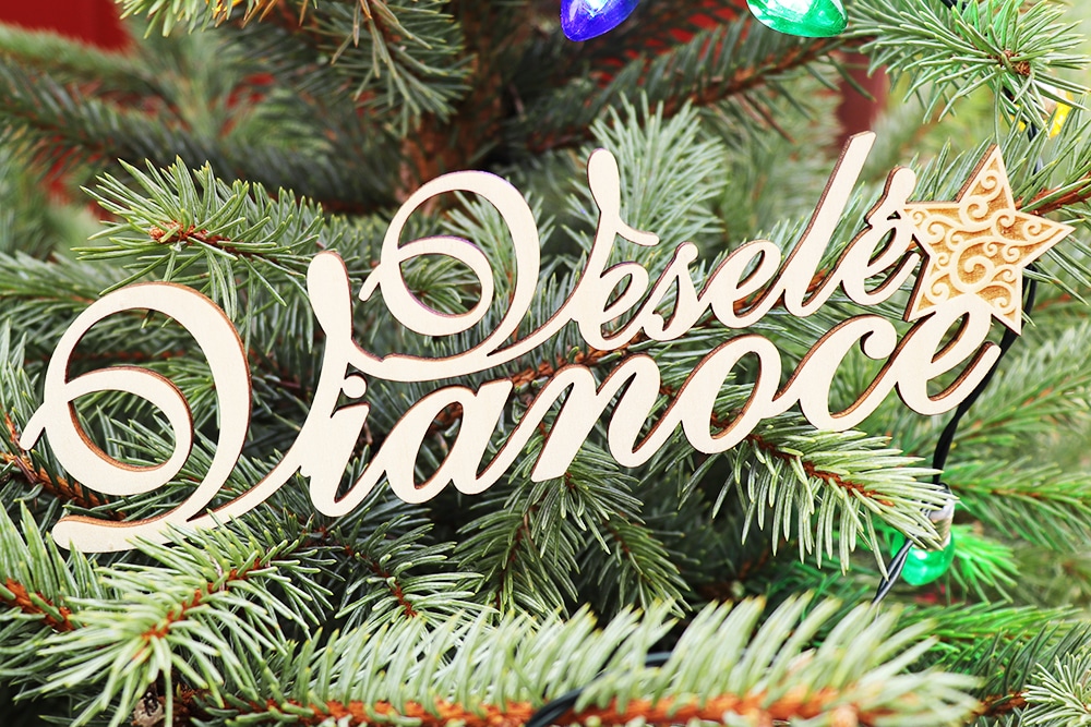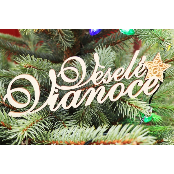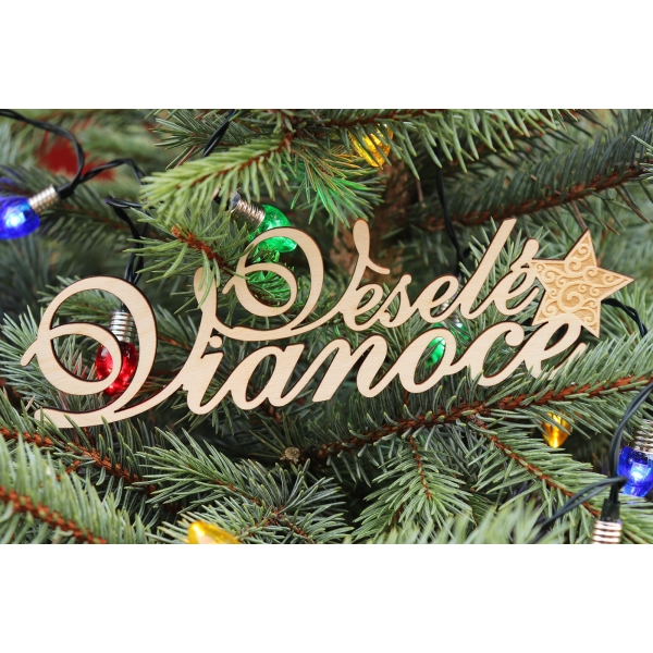 Drevený nápis Veselé Vianoce s hviezdou. Nápis je vhodný na dekoráciu na vence, kytice, ikebany … Nápis je vyrezaný gravírovacím laserom. Materiál: breza – preglejka 3 mm, povrch: prírodný. Rozmery 150 x 44 mm. Počet 1 ks.