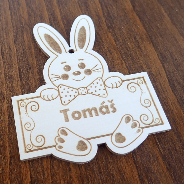 Drevený veľkonočný zajačik s vlastným menom je krásnym doplnkom na dekoráciu kytíc, vencov alebo výsluška pre šibačov. Dole nižšie je potrebné napísať zoznam mien aj s diakritikou a zvoliť požadovaný počet kusov. Veľkonočná ozdoba je vyrezaná laserom, materiál: topoľ – preglejka 3 mm, farba prírodná. Rozmery: 76 x 90 mm (ŠxV). Počet 1 ks.