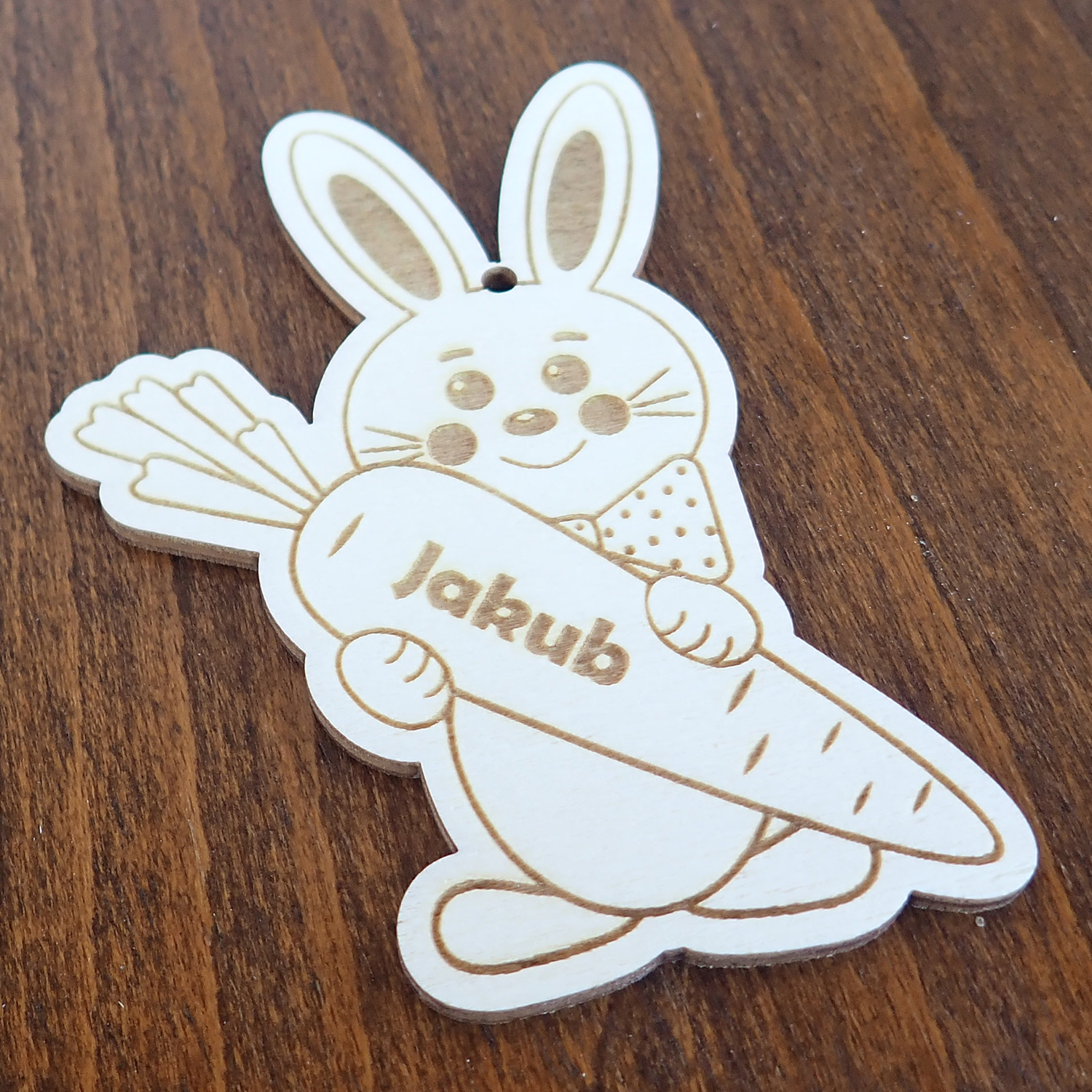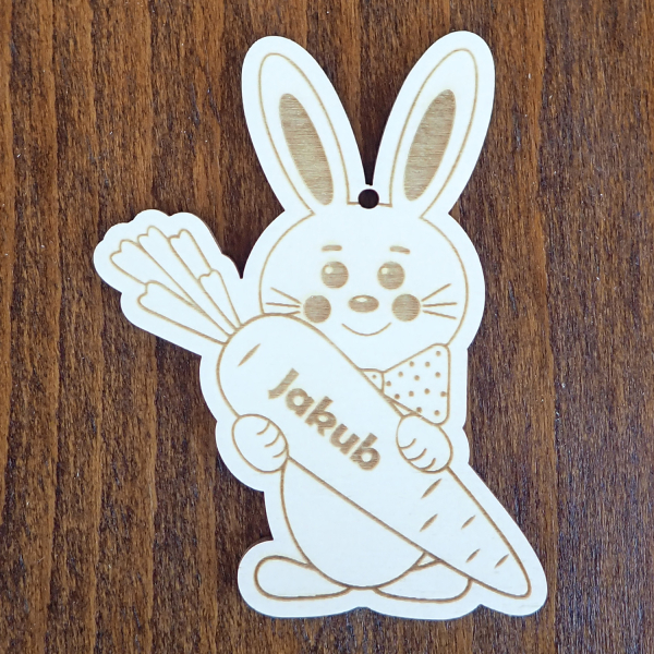 Drevený veľkonočný zajačik s vlastným menom je krásnym doplnkom na dekoráciu kytíc, vencov alebo výsluška pre šibačov. Dole nižšie je potrebné napísať zoznam mien aj s diakritikou a zvoliť požadovaný počet kusov. Veľkonočná ozdoba je vyrezaná laserom, materiál: topoľ – preglejka 3 mm, farba prírodná. Rozmery: 69 x 90 mm (ŠxV). Počet 1 ks.