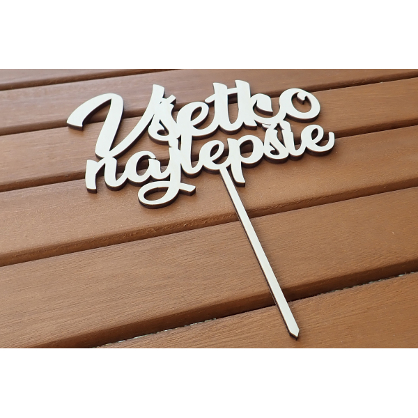 Drevený zápich na tortu Všetko najlepšie je krásnym doplnkom narodeninovej torty. Drevený zápich je vyrobený laserom z brezovej preglejky o hrúbke 3 mm, brúsený, farba prírodná. Rozmery: šírka nápisu 15 cm, výška 18,7 cm, zápich cca 10 cm. Predaj po 1 ks.
