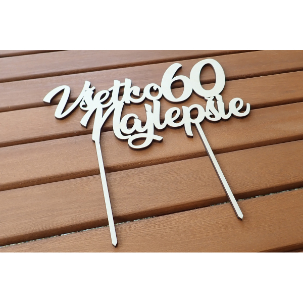 Drevený zápich na tortu Všetko najlepšie 60 je krásnym doplnkom narodeninovej torty. Drevený zápich je vyrobený laserom z brezovej preglejky o hrúbke 3 mm, brúsený, farba prírodná. Rozmery: šírka nápisu 20 cm, výška 19,8 cm, zápich cca 10 cm. Predaj po 1 ks.