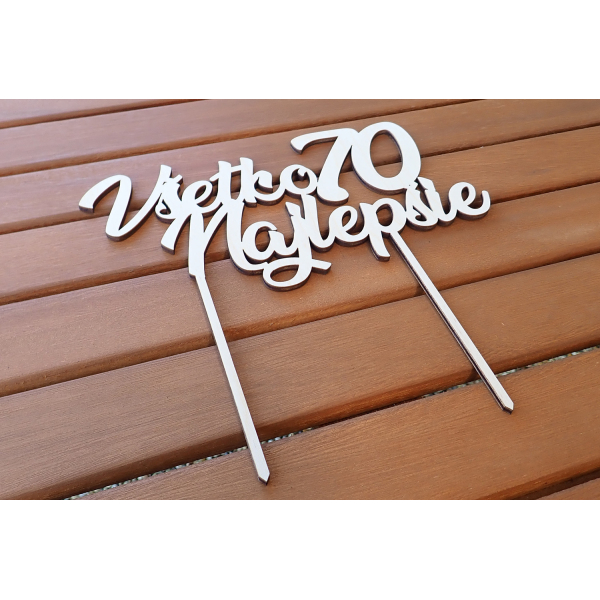 Drevený zápich na tortu Všetko najlepšie 70 je krásnym doplnkom narodeninovej torty. Drevený zápich je vyrobený laserom z brezovej preglejky o hrúbke 3 mm, brúsený, farba prírodná. Rozmery: šírka nápisu 20 cm, výška 19,8 cm, zápich cca 10 cm. Predaj po 1 ks.