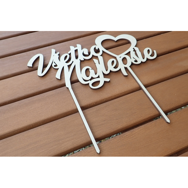 Drevený zápich na tortu Všetko najlepšie so srdiečkom je krásnym doplnkom narodeninovej torty. Drevený zápich je vyrobený laserom z brezovej preglejky o hrúbke 3 mm, brúsený, farba prírodná. Rozmery: šírka nápisu 15 cm, výška 18,7 cm, zápich cca 10 cm. Predaj po 1 ks.