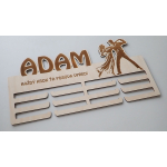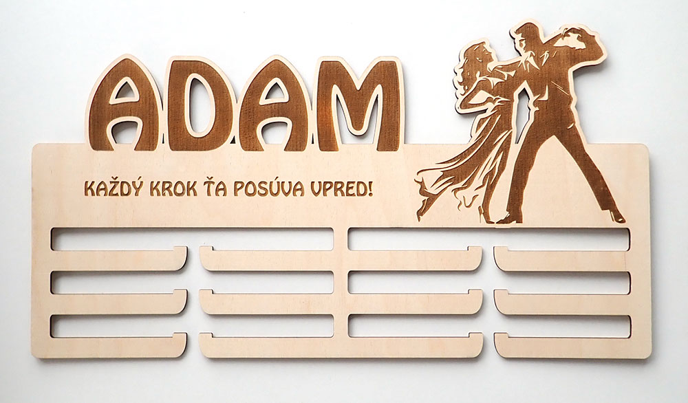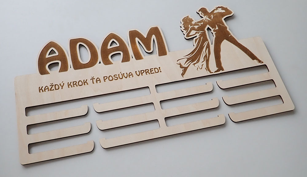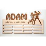 Drevený vešiak na medaile pre tanečníkov je štýlový a praktický doplnok na vystavenie tanečných úspechov. Vyrobený z kvalitnej drevenej preglejky, s elegantným dizajnom tanečníkov, je skvelým darčekom pre každého milovníka tanca. Vešiak je personalizovaný a nesie meno oslávenca, vďaka čomu sa stáva originálnym a jedinečným doplnkom. Zo zadnej strany sú dva háčiky na zavesenie, vďaka čomu ho možno ľahko upevniť na stenu. Rozmer: 50 x 27 cm, materiál: 4 mm preglejka.
