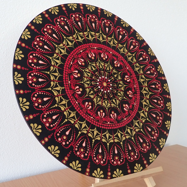Mandala ručne maľovaná v odtieňoch červenej a zlatej s priemerom 38 cm je nádherným umeleckým dielom plným tepla a luxusu. Ručné maľovanie pridáva do mandaly osobný dotyk a detaily, ktoré zdôrazňujú jedinečnosť každého kúsku. Každý kus mandaly je originálne vytvorený, čo zabezpečuje, že žiadne dve mandaly nie sú identické.