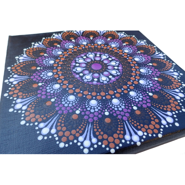Mandala je ručne maľovaná na čiernom podklade fialovo hnedej farby. Každý kus mandaly je orignál. Povrch mandaly je lakovaný. Materiál je plátno v drevenom ráme. Rozmery: 20 x 20 cm. Množstvo: 1 ks.