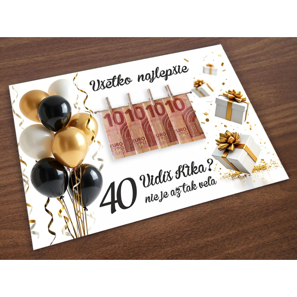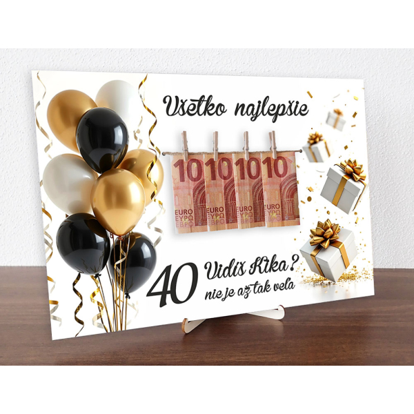 Elegantná a originálna tabuľka k narodeninám s luxusným dizajnom čiernych, zlatých a bielych balónov a darčekov. Tabuľka je vybavená úchytmi na bankovky, vďaka čomu môžete darovať peniaze štýlovo a kreatívne. Perfektný darček na výnimočné jubileum.