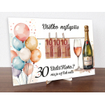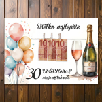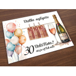 Originálna darčeková tabuľka k narodeninám s elegantným dizajnom obsahujúcim motív fľaše šampanského a balónov. Ideálny darček na oslavu významného jubilea.