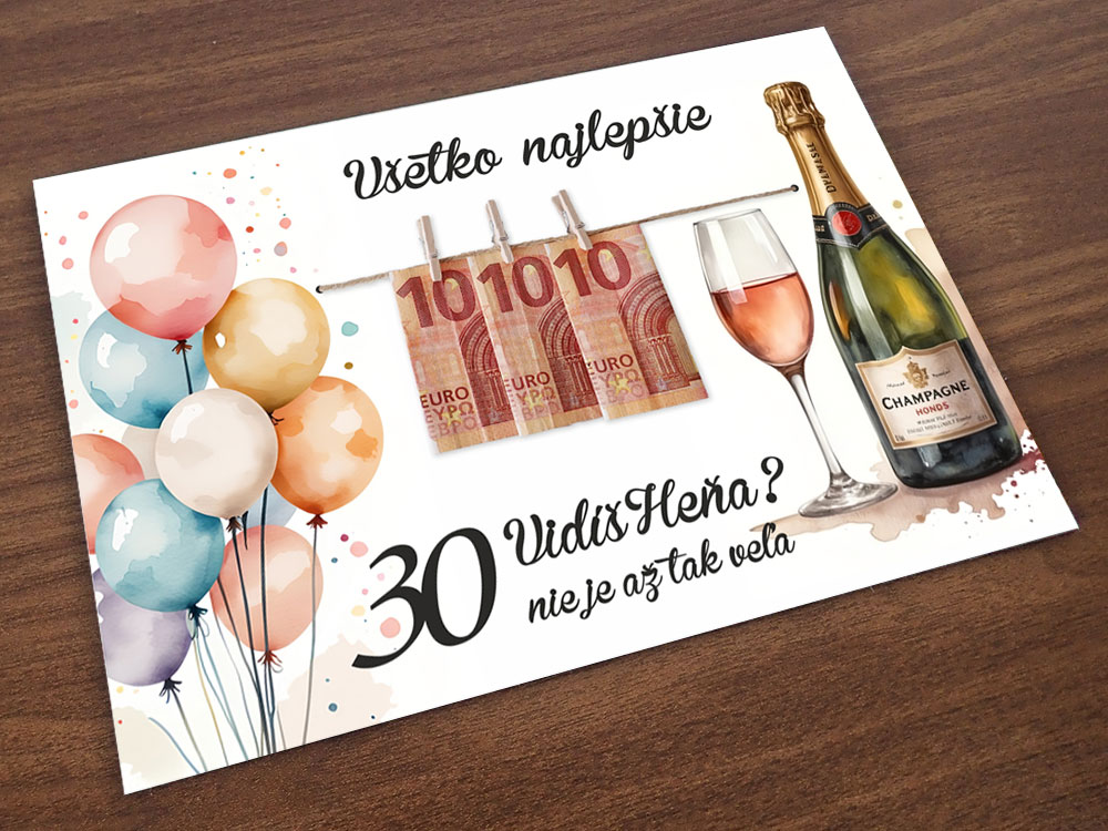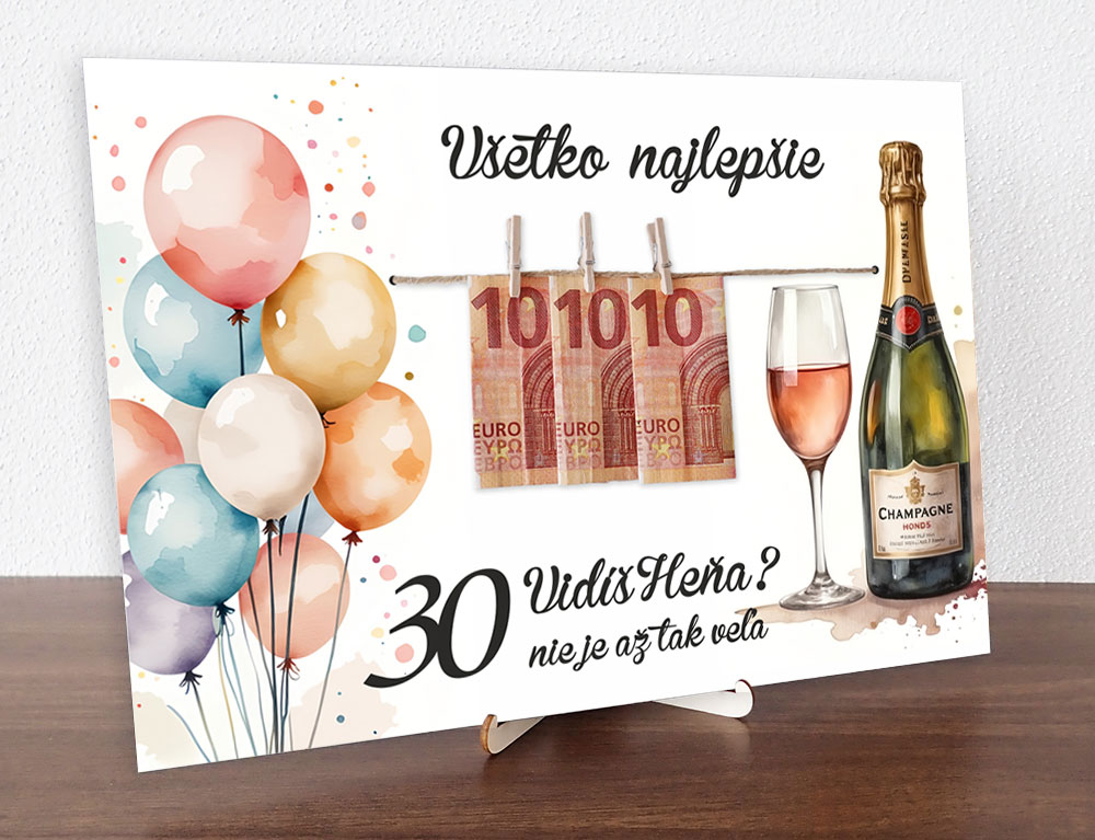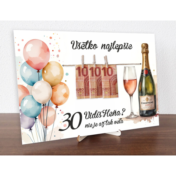 Tabuľka k narodeninám s farebnými balónmi a fľašou na peniaze