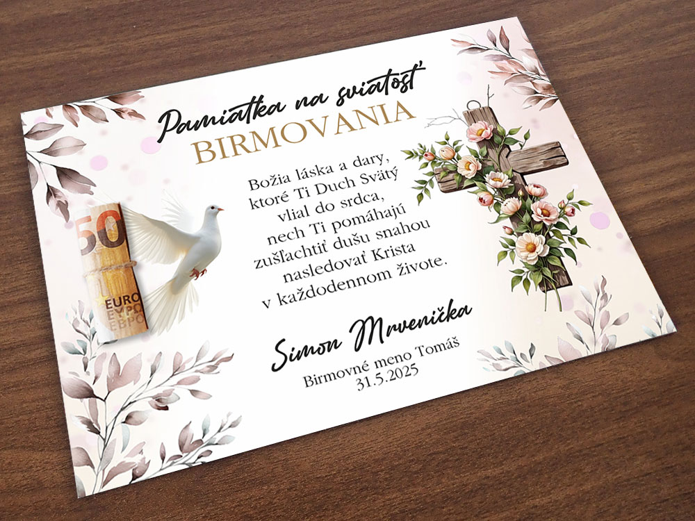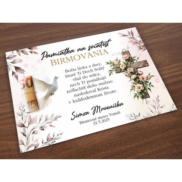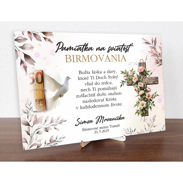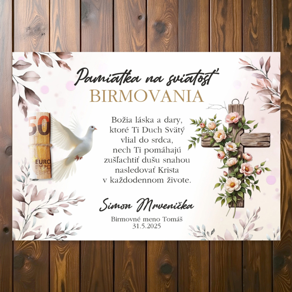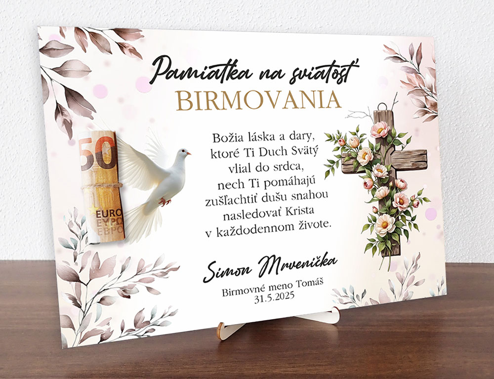 Elegantná darčeková tabuľka navrhnutá špeciálne k sviatosti birmovania. Jemný dizajn v ružovej farbe symbolizuje čistotu, radosť a duchovnú silu. Ideálny darček ako pamiatka na tento výnimočný duchovný deň.