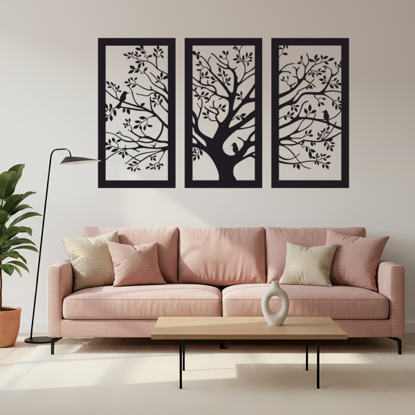 Originálna trojdielna dekorácia s motívom stromu s vtákmi prinesie do interiéru pocit prírody a pokoja. Detailne spracovaný strom doplnený siluetami vtákov vytvára harmonický a zároveň výrazný prvok, ktorý prirodzene upúta pozornosť.